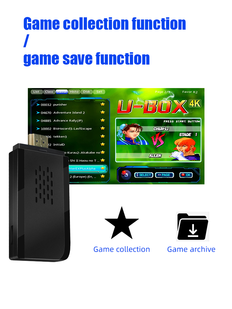 With upgraded GB2 CPU chip, the game stick 4K TV games console is built-in more than 9 Emulators, compatible for MAME, PS1, GB, GBA, GBC, MD, SFC, FC and ATARI format games, which you can download and save at its Memory Card;