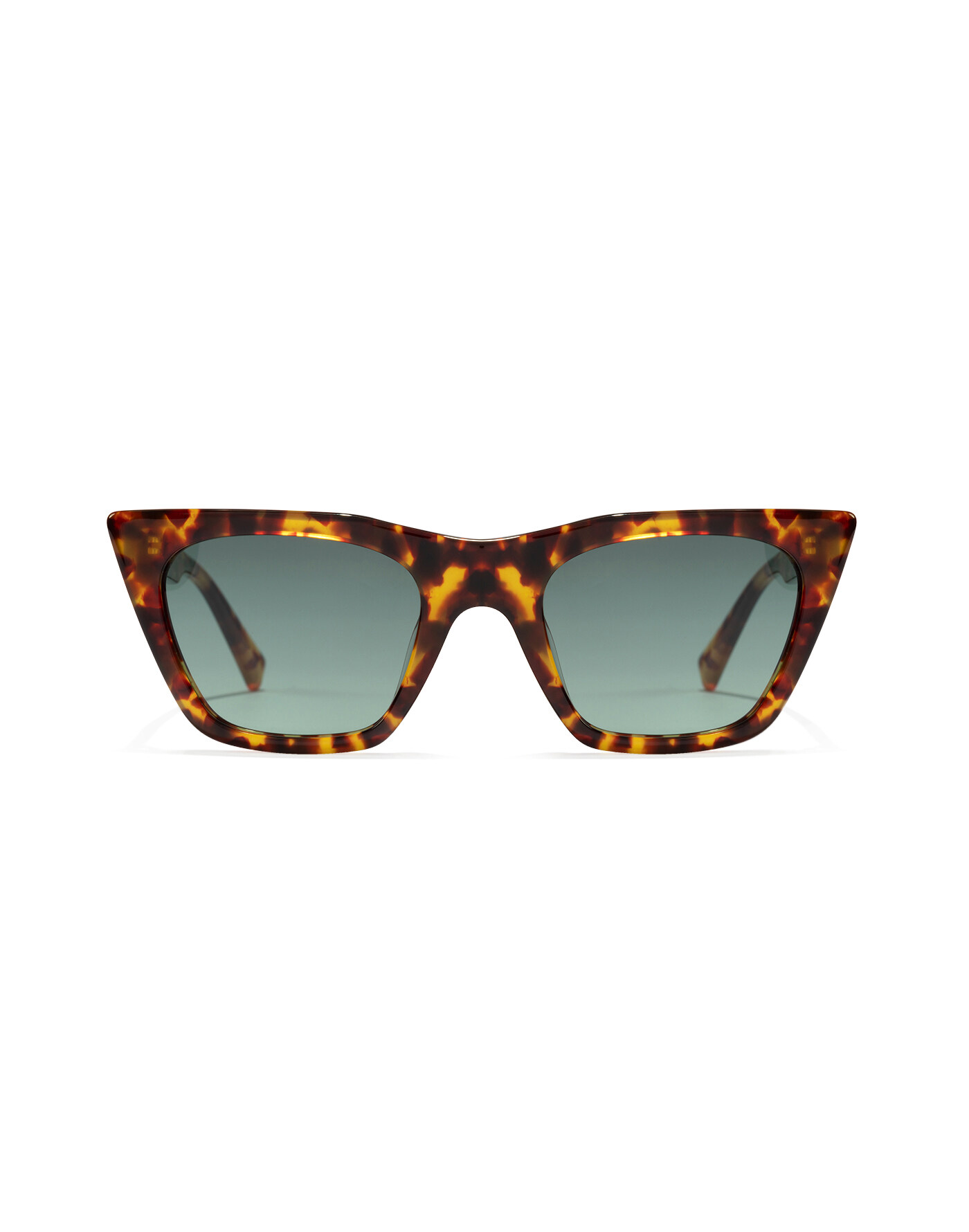 Polished tortoiseshell print sunglasses with cat eye silhouette. The pronounced angles and elegant temples are graceful and chic, and the bottle green lenses contrast subtly with the frame.