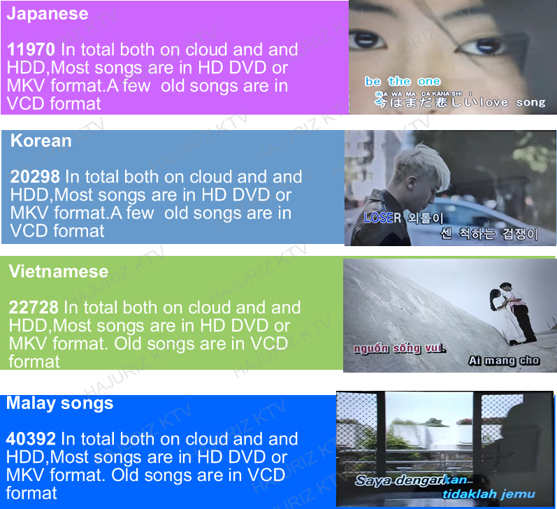2.Download songs from cloud .There are more than 400K different language songs(Mandarin,Cantonese,Taiwanese,Vietnamese,English,Korean,Japanese,Thai,Burmese,Malay,Filipino,Spanish,etc. More than 10 kinds of songs on cloud ) on Cloud for download.The system updates songs each every week.It will hint Synchronize new updates cloud songs if there are new songs.