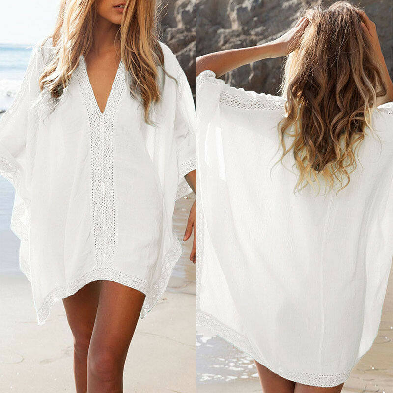 Kraiefs Women Solid Cover Up Kaftan Mini Dress V Neck Beachwear Swimwear Beach Bikini Au