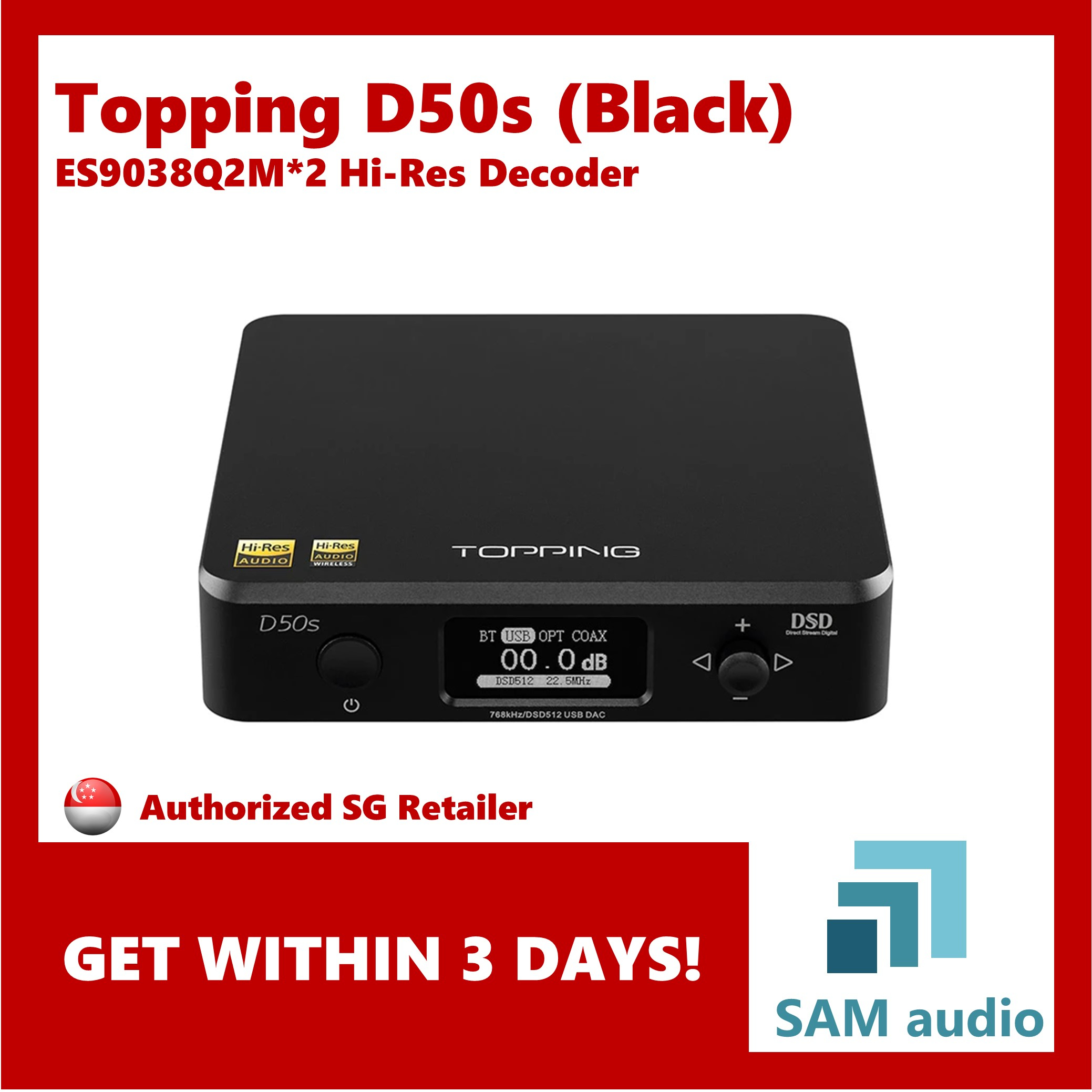 >USB of D50s supports DSD64-DSD512(Native)and PCM16bit/44.4kHz-32 bit/768 kHz. Coaxial and Optical inputs support up to PCM 24 bit/192 kHz and DOP DSD64.