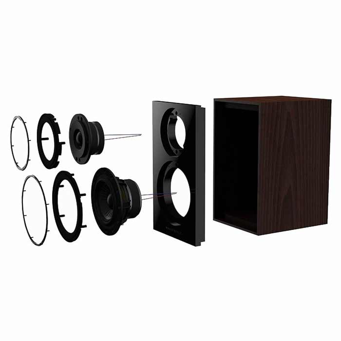 The crossover network uses an acoustic LKR 24dB topology. This includes air-core inductors of the type more commonly found in high-end speakers, selected because they produce the lowest distortion of all inductor types. As the resistance of the coil is higher than a standard laminated steel or ferrite core inductor, the magnetic structure of the mid/bass driver has been modified to compensate, resulting in fast, clean bass with no distortion from the inductor.
