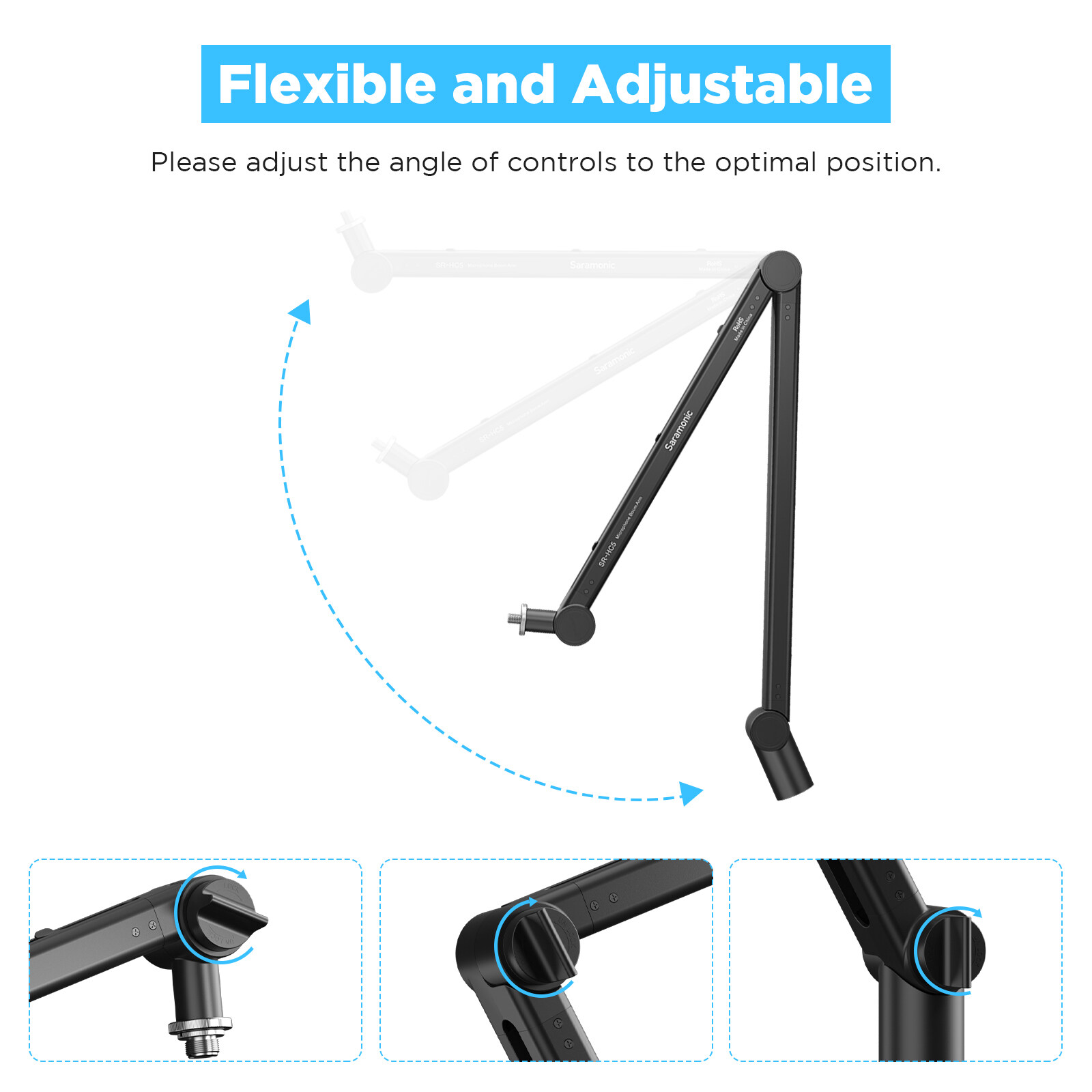 With the smooth Locking knob, the SR-HC5 microphone boom arm is easy to adjust which could be simply moved up and down 180°to provide you a perfect angle. The hidden cable management saves your desktop the mess of tangled cables, frees up a lot of space on your desk, and keeps a neat and clean look while recording.