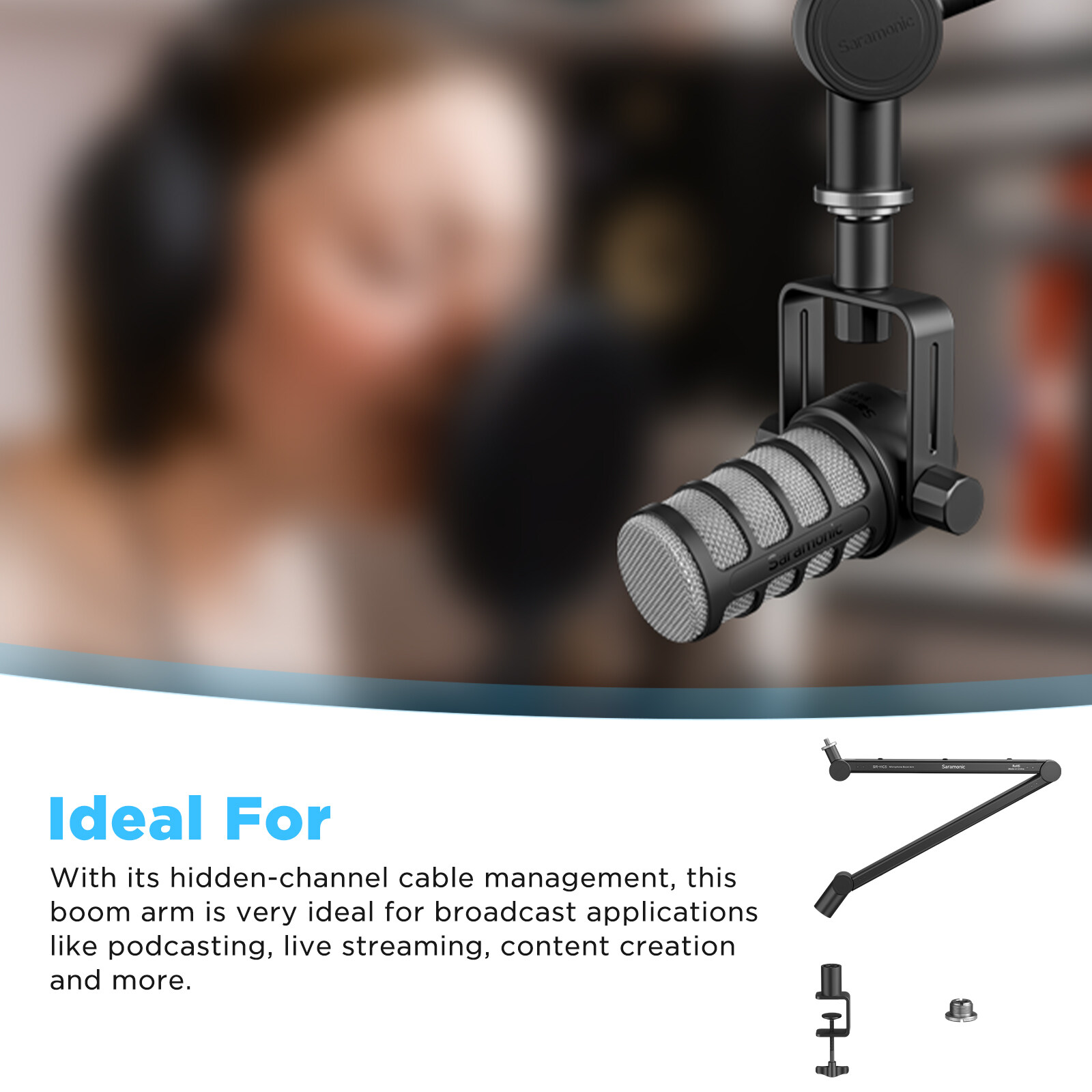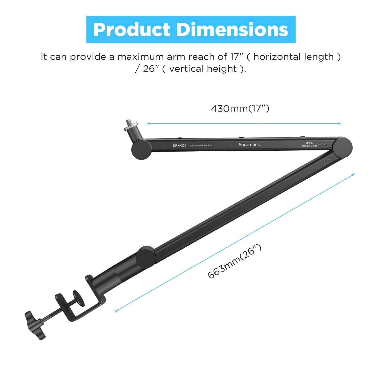 Saramonic SR-HC5 aluminum alloy construction 5/8″ to 3/8″ Microphone Boom Arm with a durable C-clamp mount for broadcast, podcasting, live streaming, home studio