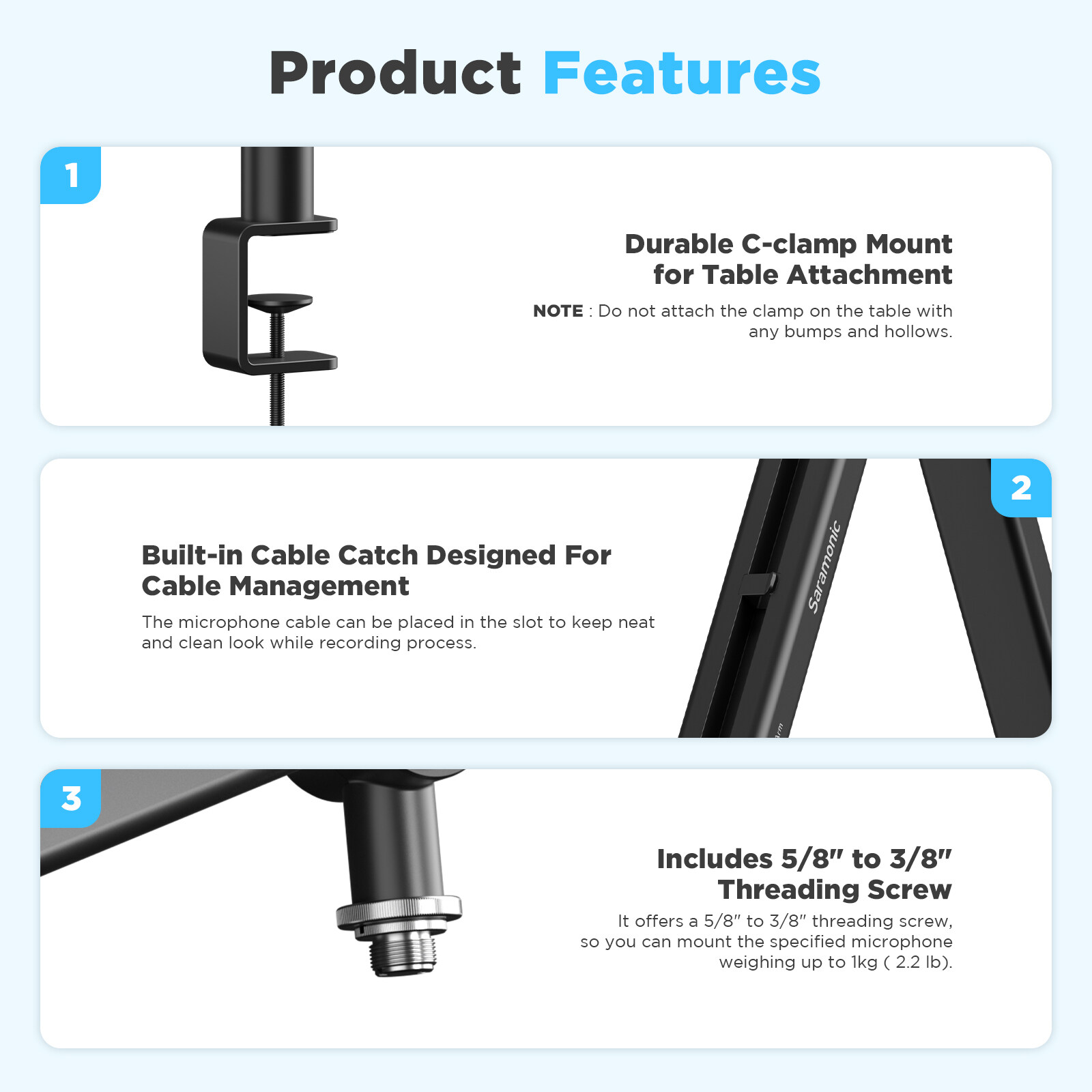 This broadcast arm features a 5/8″ to 3/8″ adapter, which is compatible with different kinds of microphones including Saramonic SR-MV2000, SR-MV7000, SR-BV1, or any other microphones weighs up to 1kg (2.2lb).