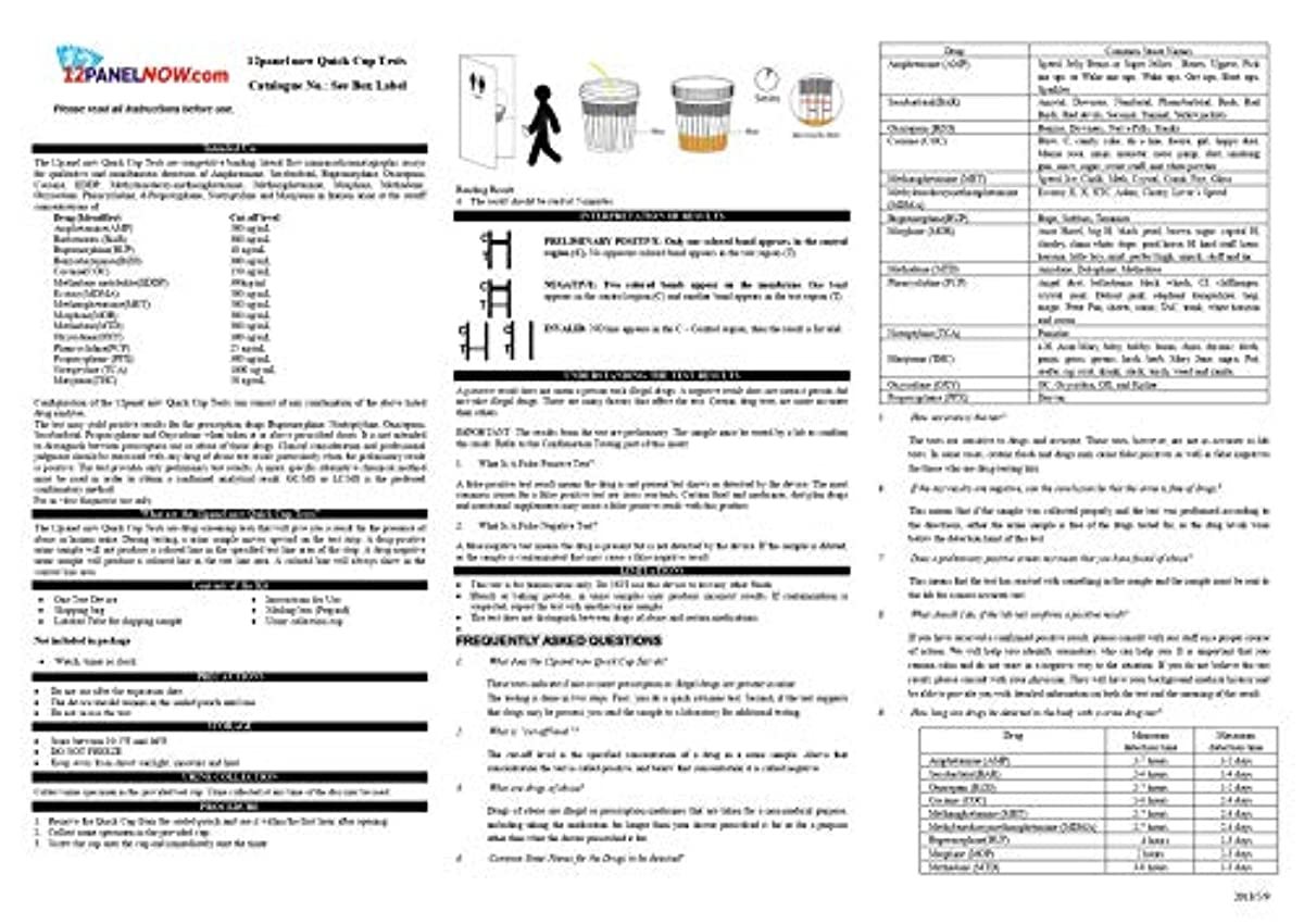 Results of the 8 Panel Test Cup can be viewed in as little as two minutes or less, although it is recommended that you assess the urine specimen five minutes after the test has been taken. Do not wait longer than eight minutes to interpret the result.