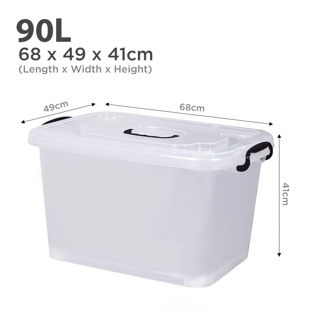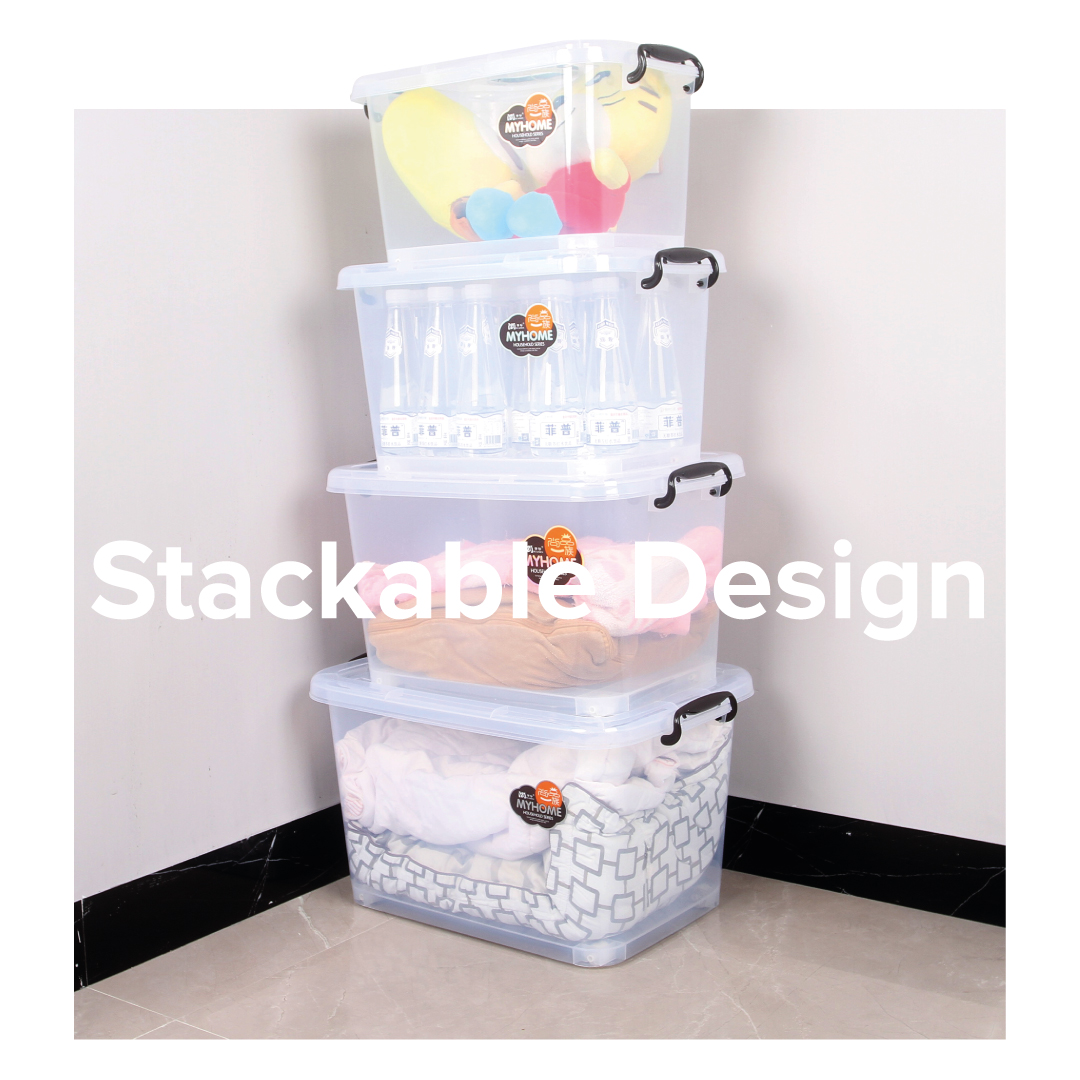 LAURA TRANSPARENT STORAGE BOX, STACKABLE DESIGN WITH HANDLE AND WHEELS. MAKES MOVING AND CLEANING EASIER AND HASSLE FREE.