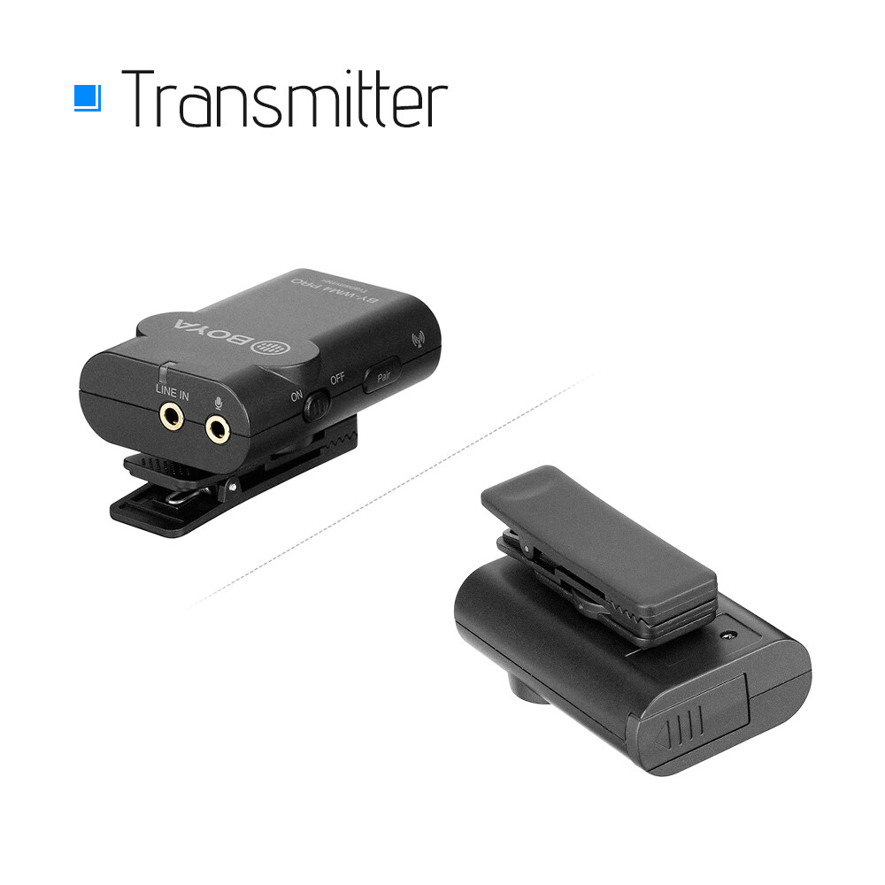 Omnidirectional lavalier microphone for clear sound recording; backside clip design allows you to mount the transmitter to belt or pocket easily.