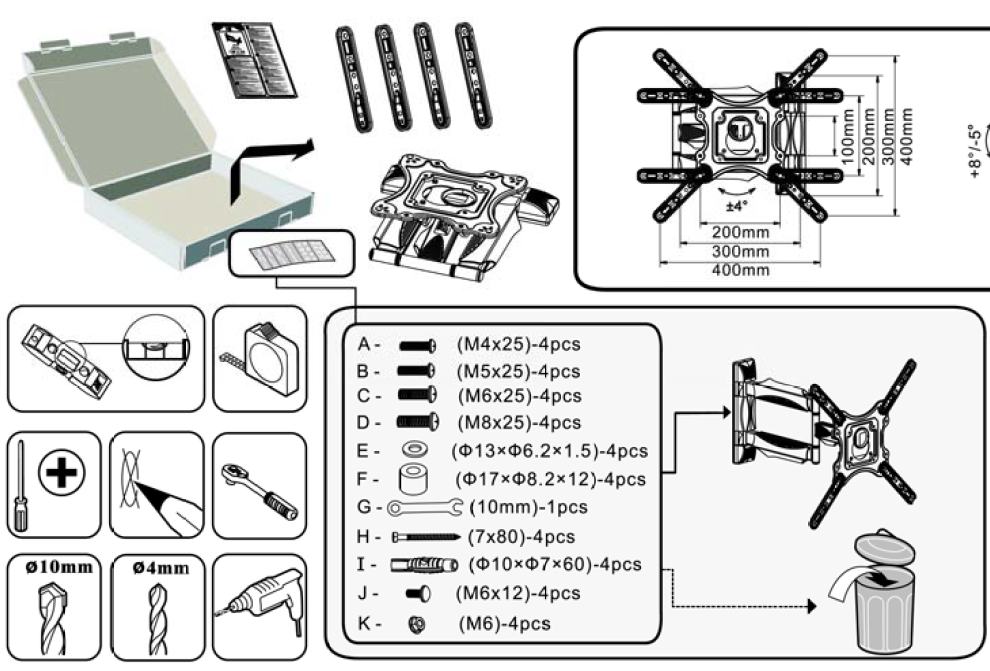 VESA compliance : 100*100,200*100, 200*200, 300*300, 400*200, 400*300, 400*400mm.