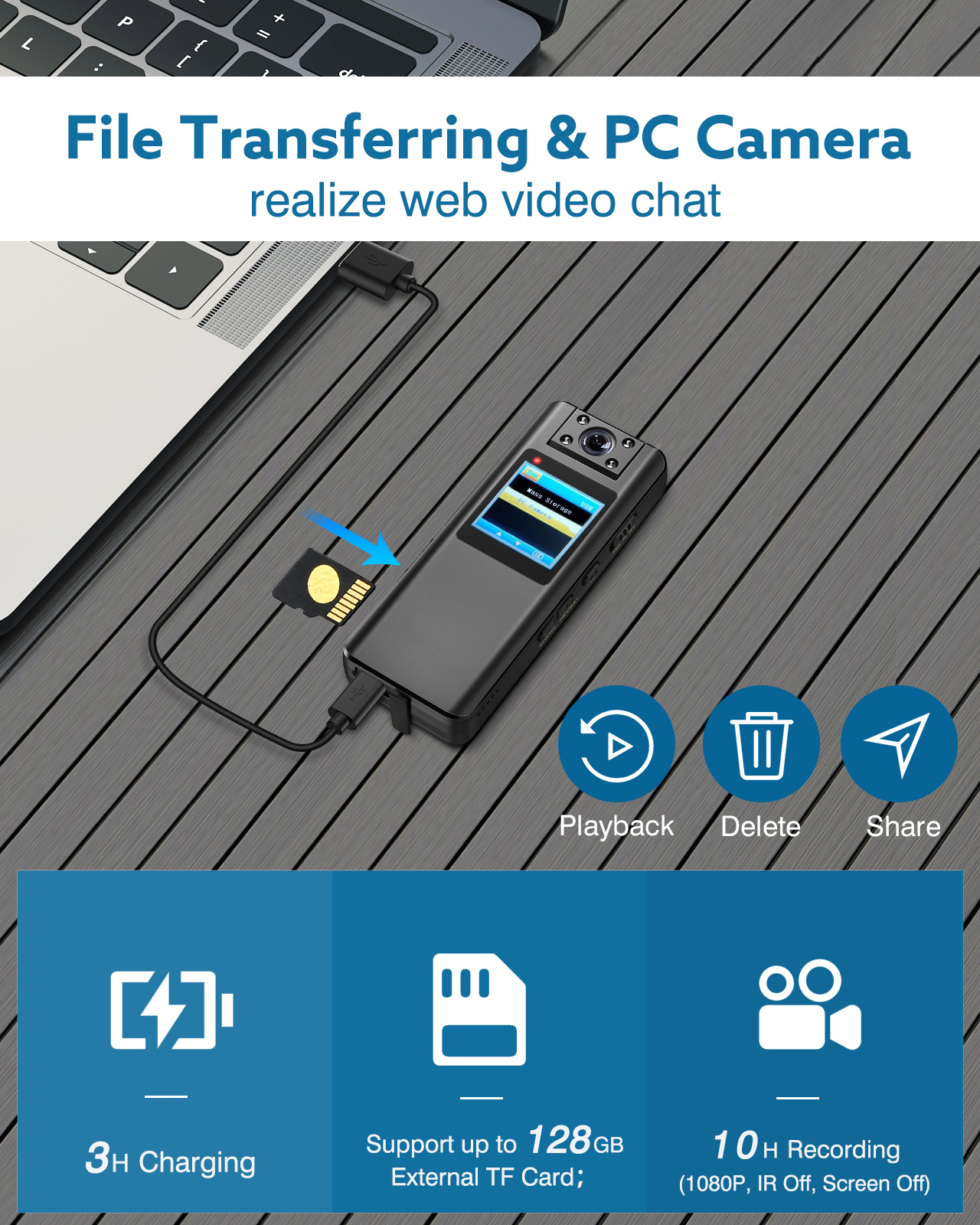 - A 1.3 inch LCD screen works for real-time viewing and managing the recorded videos/audios/photos on the mini body camera as you want, anytime anyplace.