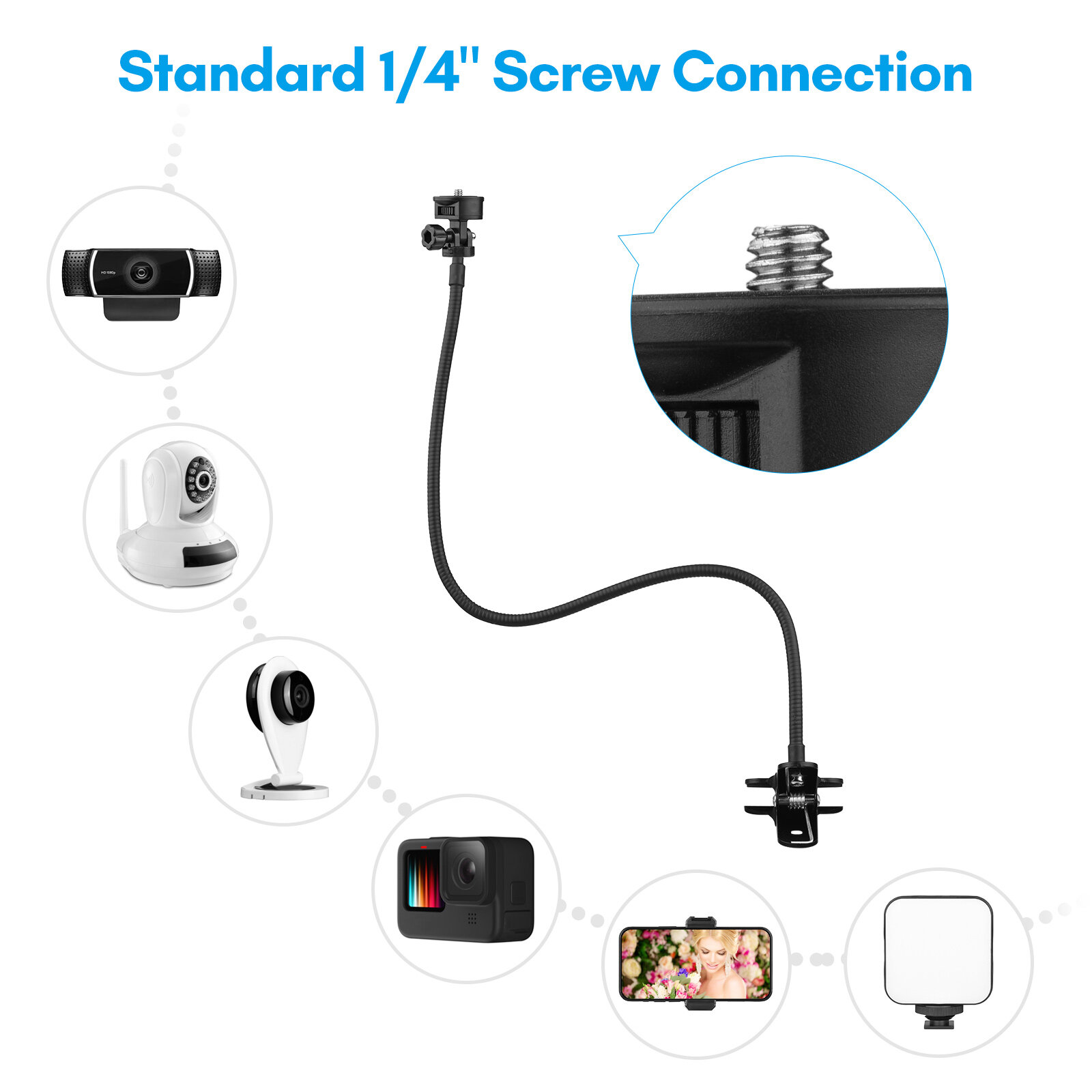 inch screw, the webcam stand is compatible with most webcams, also suitable for sports camera, small