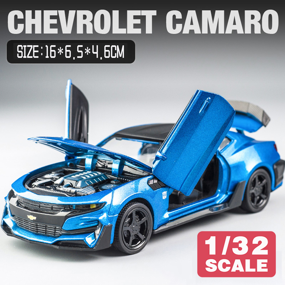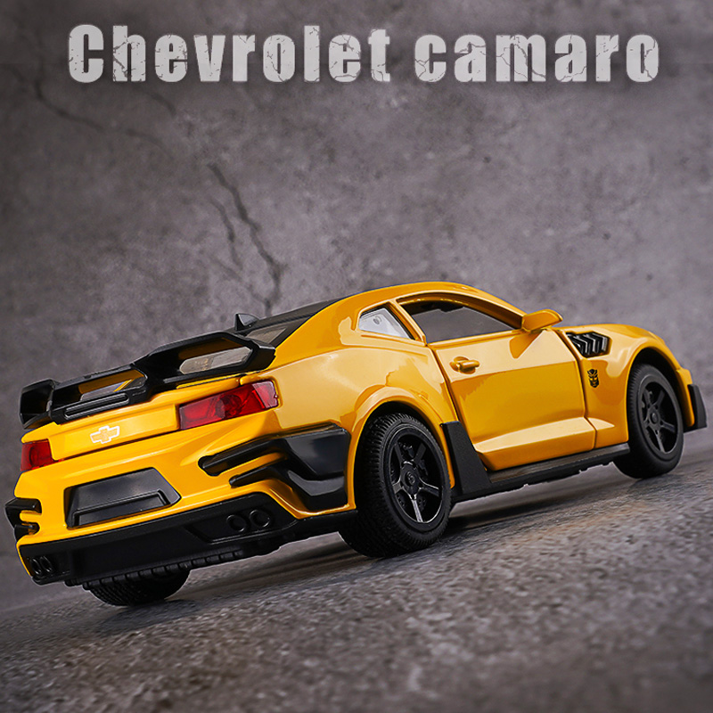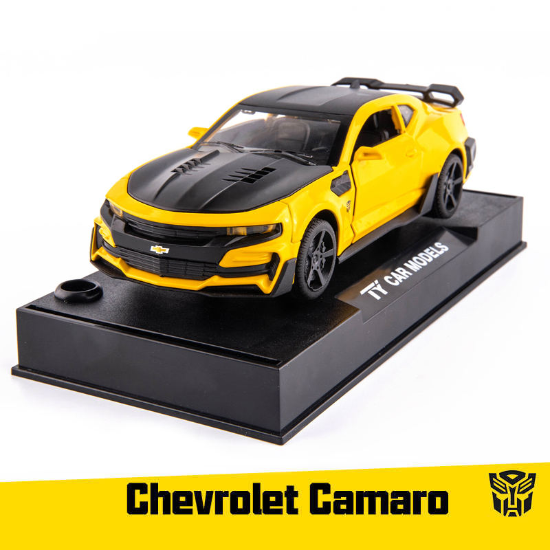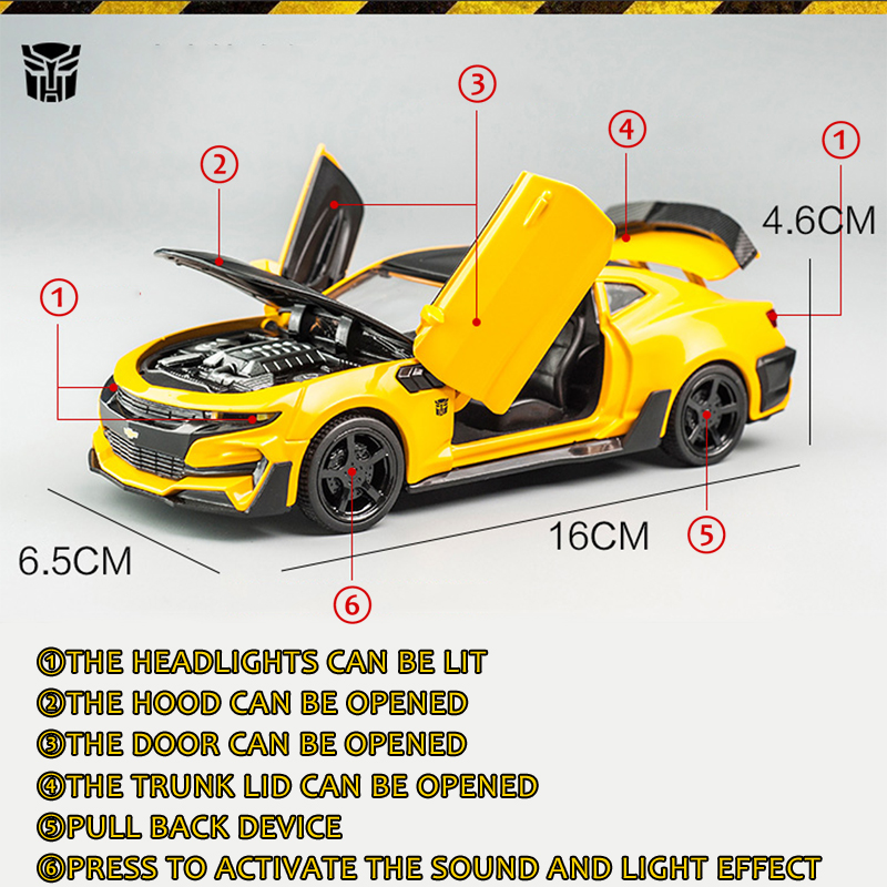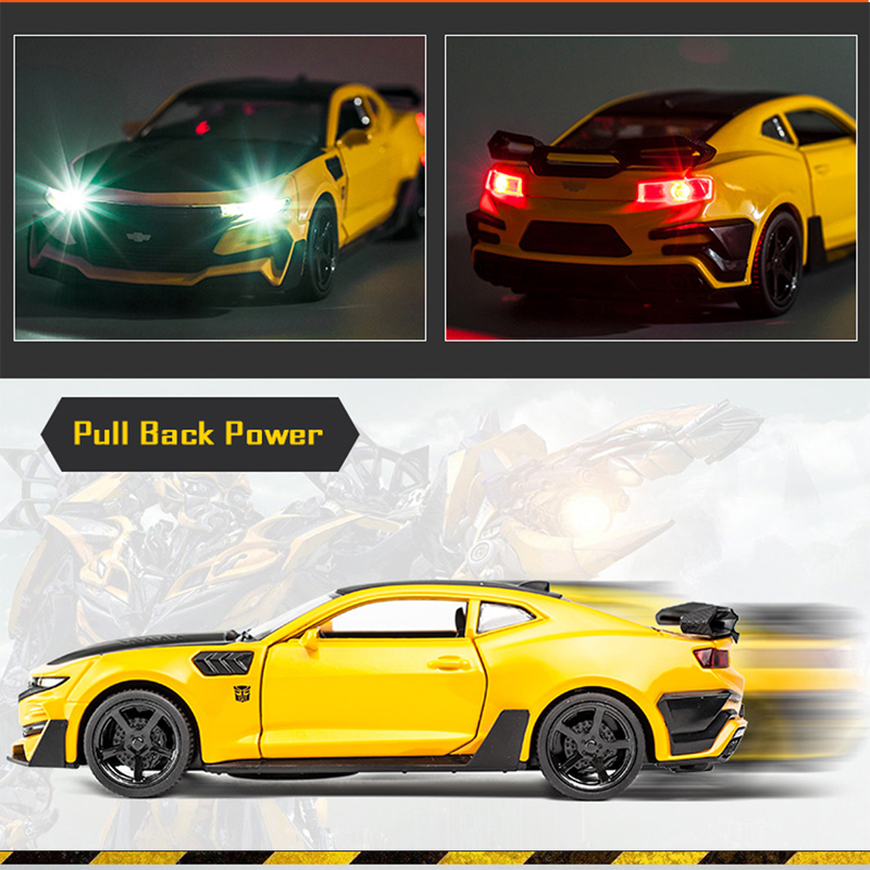 Name: Bumblebee CamaroColor: red, black, yellow, blueMaterial: Alloy PlasticProportion: 1:32Control method: pull backFeatures: Lights and music, The door can be openedProduct size: 16 * 6.5 * 4.6cmApplicable age: ≥3 years oldPackaging: Color box / no color box