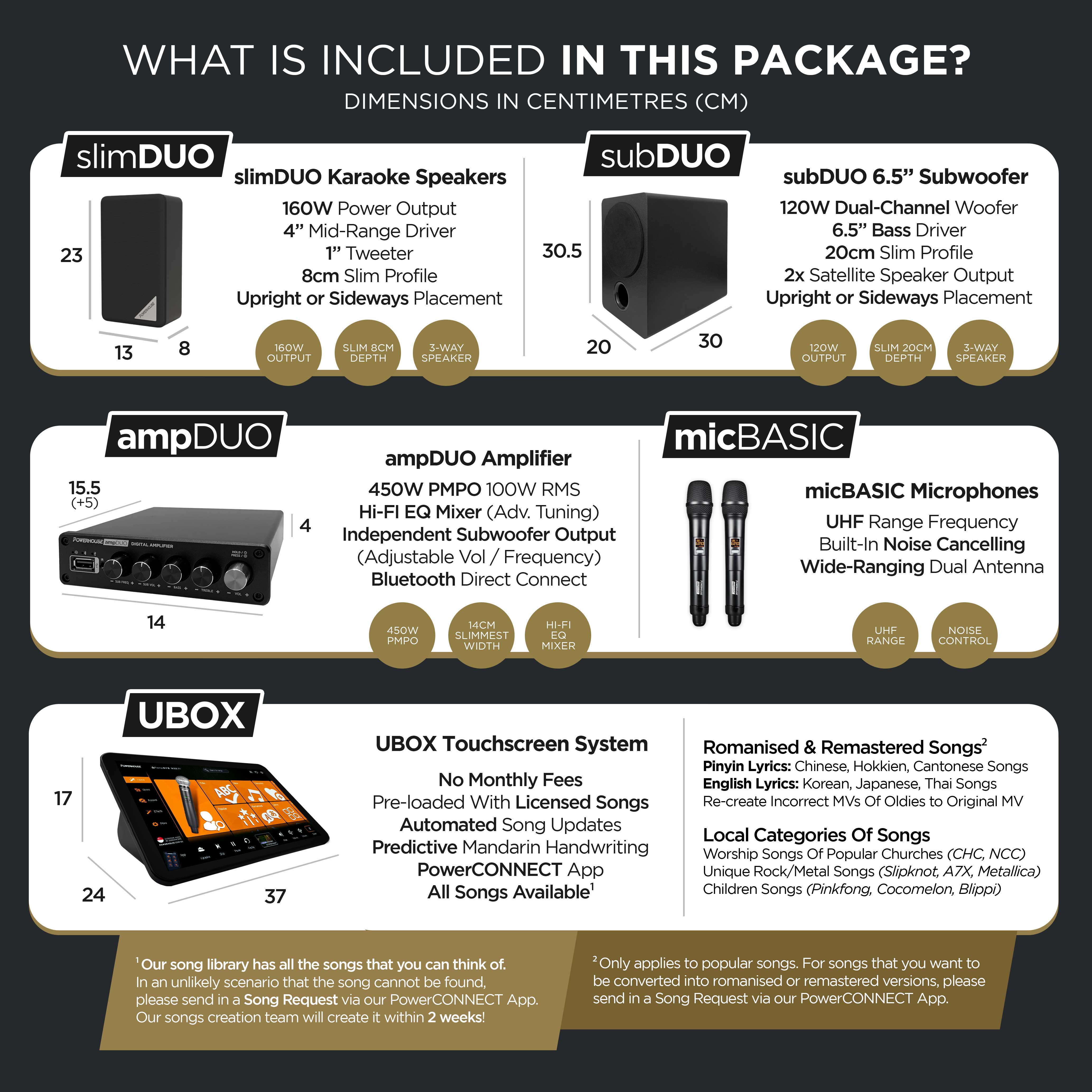 Karaoke system for home is now made affordable with our new "Powerhouse Slim Starter Home Karaoke System"! We have redesigned karaoke system speakers to be just 8cm thick, made specially for Singapore homes. Amazingly slim yet powerful with 450W of superb sound quality for that perfect home karaoke system experience! This karaoke system package comes complete with our flagship "Powerhouse Touchscreen Karaoke System With Songs" or "Powerhouse Android Box (Non-Touchscreen) Karaoke System With Songs" that includes all your karaoke songs preloaded with free automated weekly songs updates! Enjoy unlimited access to our entire Songs Library of 17 Karaoke Songs Languages. It's time to get a KTV system for your home now!